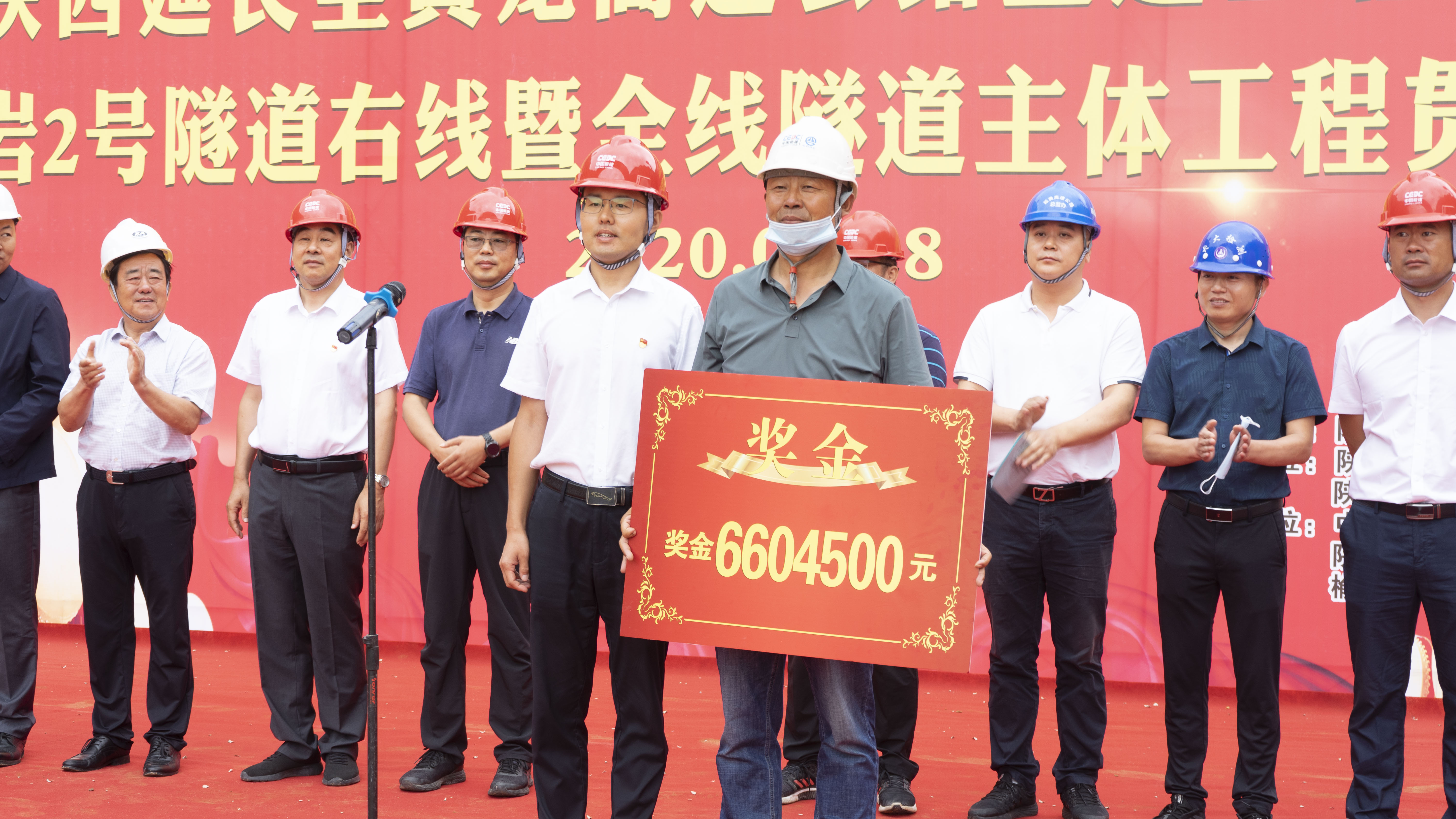 參加我公司隧道貫通儀式的有總包部、駐地辦、總監(jiān)辦、業(yè)代處、設(shè)計院、延黃高速公路項目公司,以及陜西省交通廳質(zhì)監(jiān)站等上級主管單位的領(lǐng)導,在貫通儀式上級主管單位分別對我公司承建的延黃高速公路土建4標段的工程施工進度、工程質(zhì)量和安全文明施工給與了充分的肯定和贊許,并希望我分部繼續(xù)努力、擔當起延黃高速公路項目的排頭兵,儀式最后項目公司總工程師王峰代表延黃項目公司給我分部頒發(fā)了6604500元的獎金,以資鼓勵。