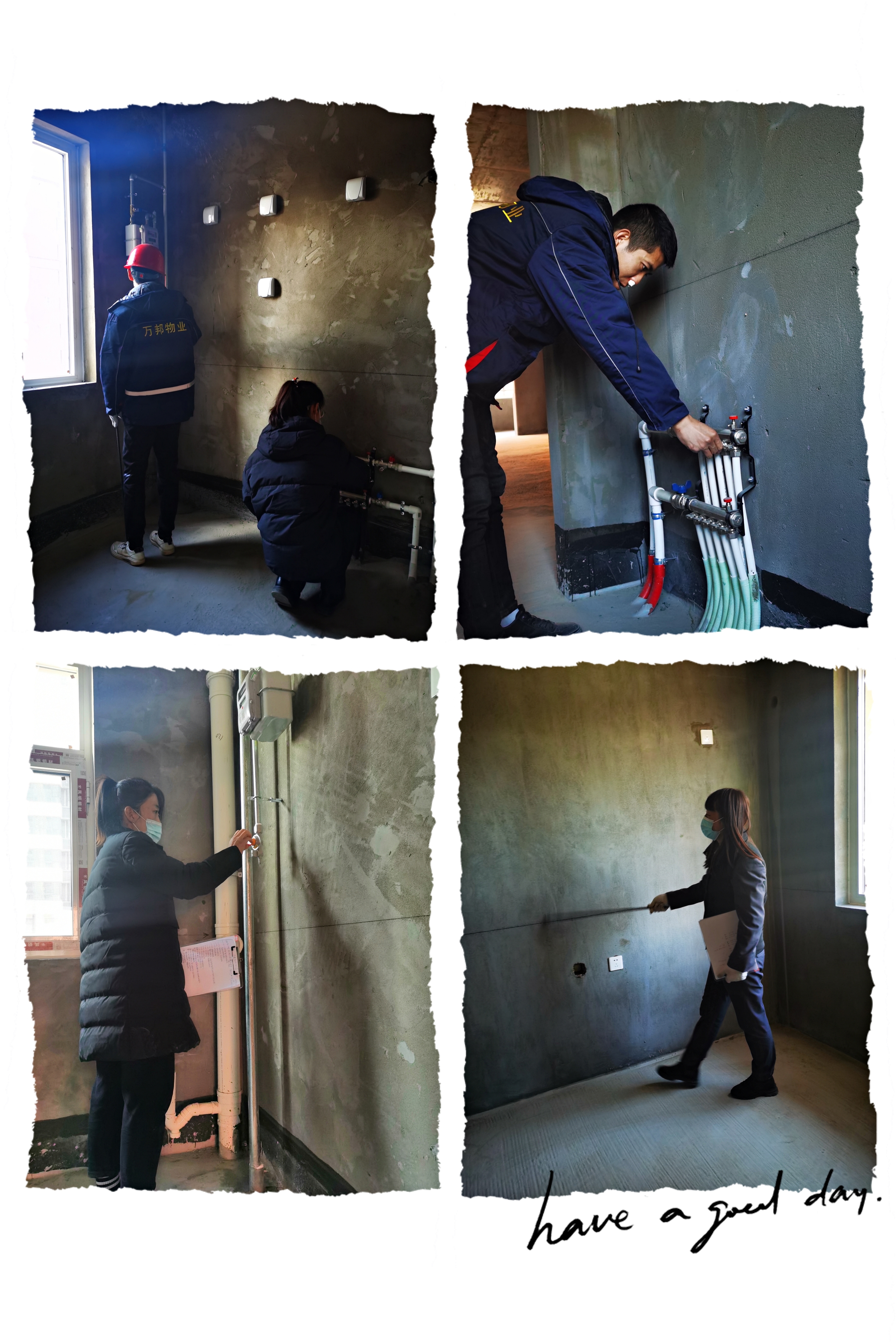 為了確保驗房進度和質(zhì)量,物業(yè)中心實行兩人一組分組操作,工程部工作人員負責檢驗實操,客服部工作人員負責記錄登記。一絲不茍、兢兢業(yè)業(yè)走進每一戶、查看每一面墻、測試每一個分水器、檢查每一扇窗,及時地將發(fā)現(xiàn)的問題記錄并反饋給施工方修繕處理。
