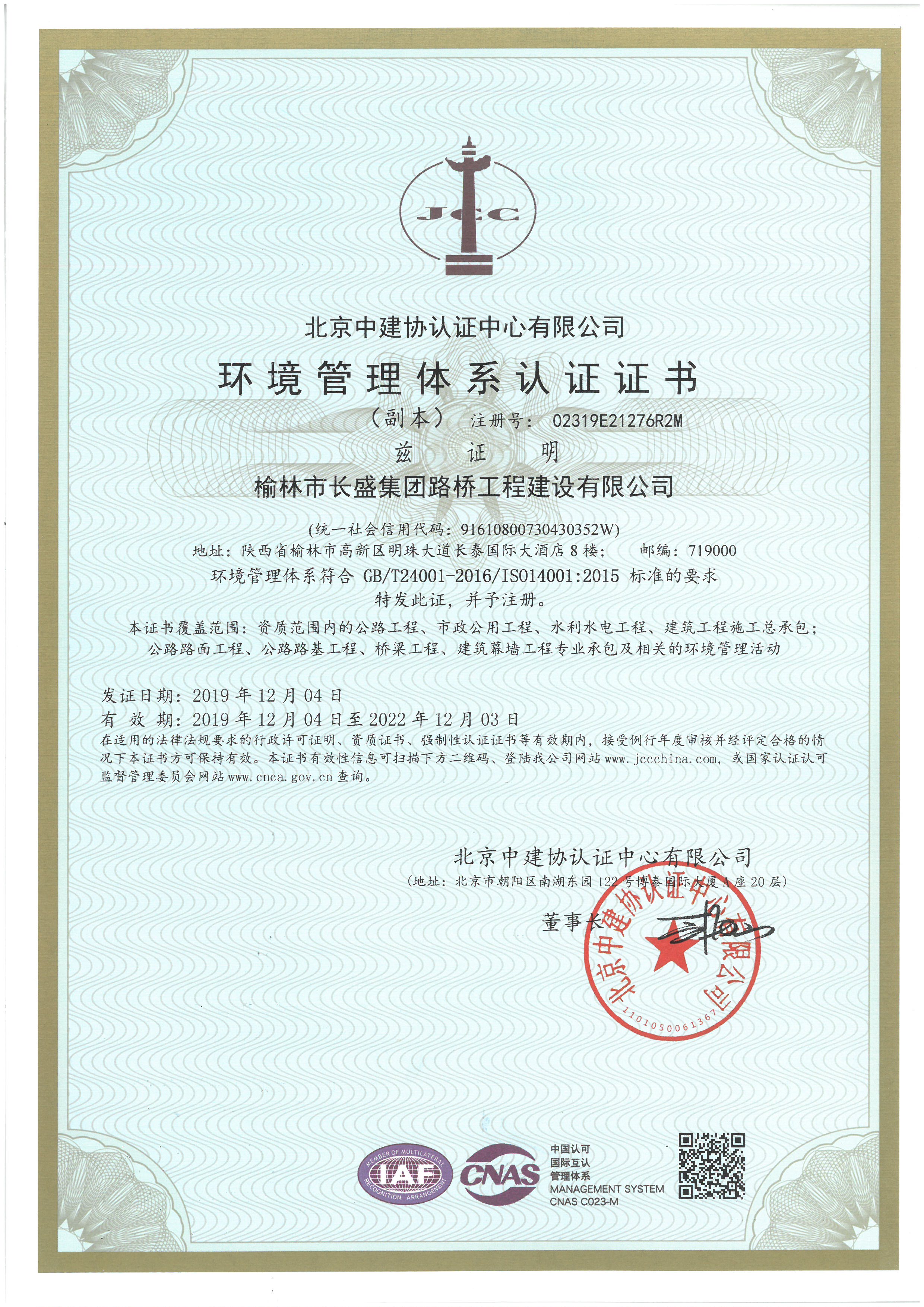 環(huán)境管理體系認(rèn)證證書