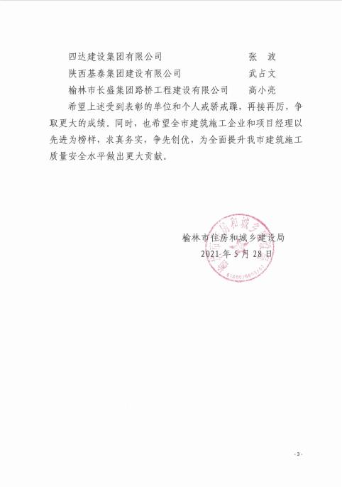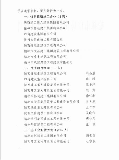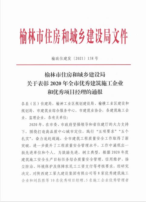 榆林市住房和城鄉(xiāng)建設局關于表彰2020年全市優(yōu)秀建筑施工企業(yè)和優(yōu)秀項目經理的通報