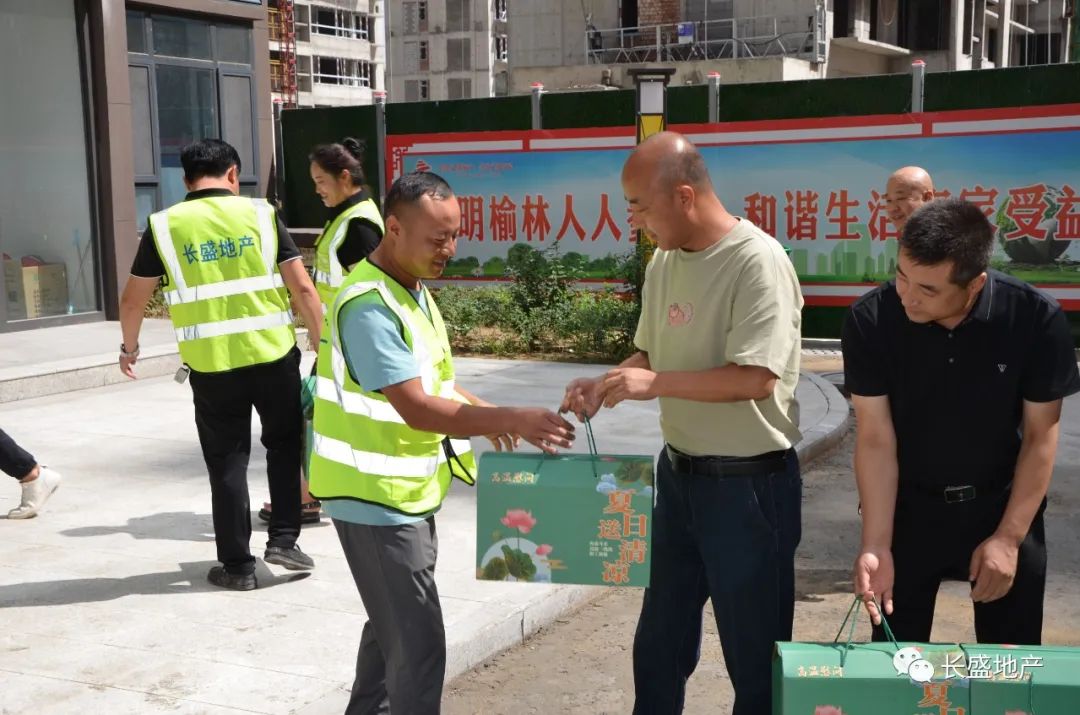 7月13日,榆林市長(zhǎng)盛集團(tuán)房地產(chǎn)開發(fā)有限公司開展2022年度“情系職工送清涼”慰問(wèn)活動(dòng),看望慰問(wèn)榆林區(qū)內(nèi)在建項(xiàng)目一線員工,為他們送去小米、綠豆、白糖、西瓜等防暑降溫物品。