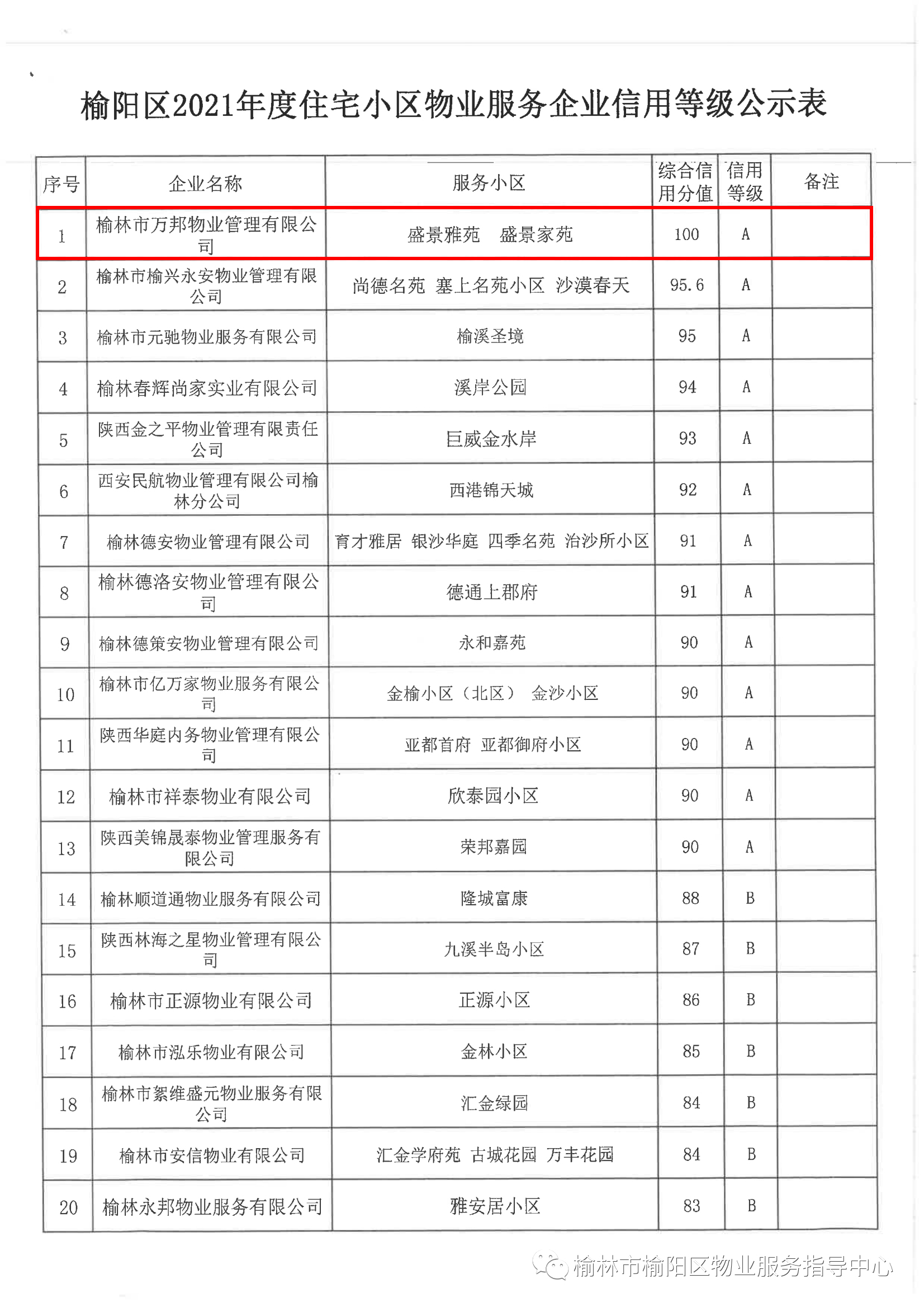 近日,榆陽區(qū)發(fā)布2021年度住宅小區(qū)物業(yè)服務(wù)企業(yè)信用等級(jí)公示,榆林市萬邦物業(yè)管理有限公司憑借歷年來在物業(yè)行業(yè)的精耕細(xì)作和誠(chéng)信經(jīng)營(yíng),順利通過信用等級(jí)評(píng)定,以綜合信用分值100分、信用等級(jí)A級(jí)位居榜首。